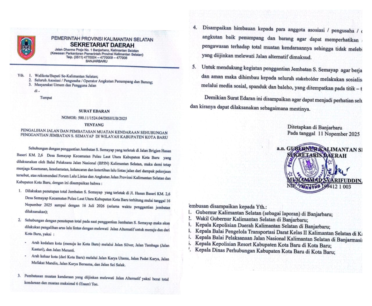 – Pemerintah Provinsi Kalimantan Selatan melalui Sekretariat Daerah resmi mengumumkan penutupan total Jembatan S. Semayap di Kabupaten Kotabaru. Kebijakan ini tertuang dalam Surat Edaran Nomor 560.11/1524.04/DISHUB/2025 tentang Pengalihan Jalan dan Pembatasan Muatan Kendaraan Sehubungan dengan Penggantian Jembatan S. Semayap.