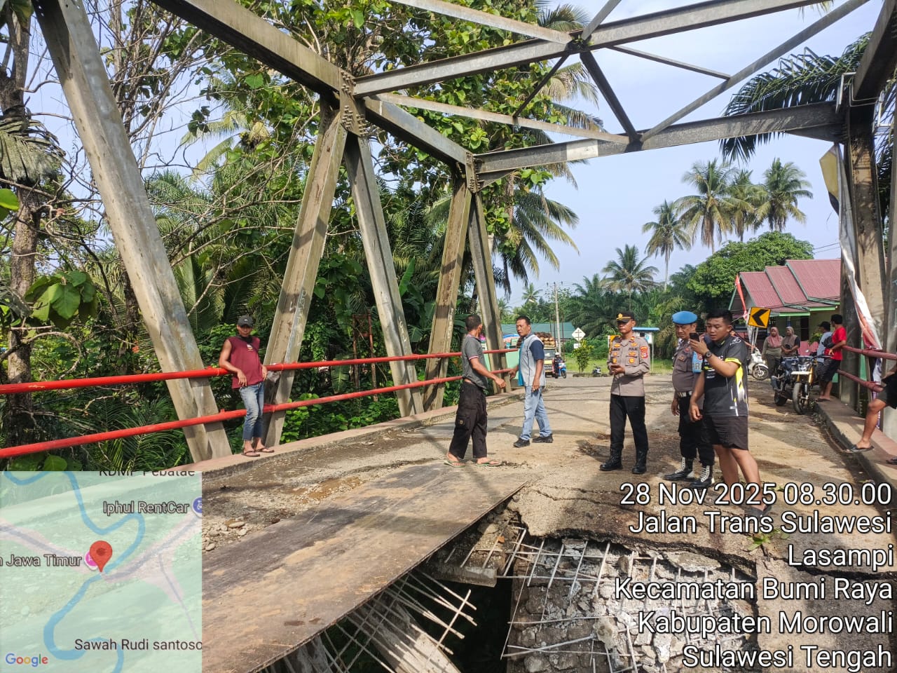Amblasnya Jembatan penghubung antara Desa Lasampi dan Desa Pebatae Kecamatan Bumi Raya Kabupaten Morowali Provinsi Sulawesi Tengah “mengundang” Personel Polres Morowali bergerak cepat Kelokasi untuk menindaklanjuti atas amblasnya jembatan penghubung yang terjadi pada Jumat 28 Nov 2025.